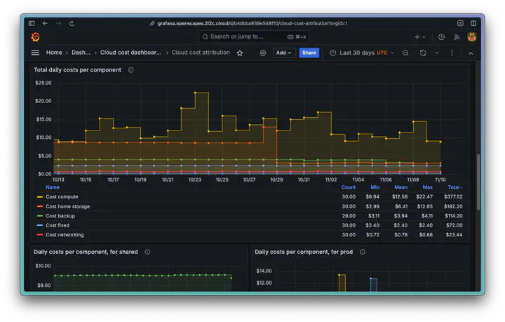 The dashboard can be shared with other community members and stakeholders so they can understand usage and cost patterns. Community Champions can export data to a CSV file, or they can generate a snapshot of the Grafana dashboard and share a public link.