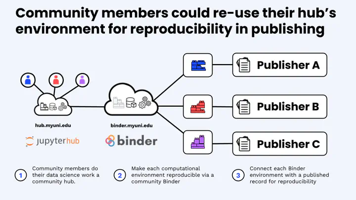 Publishers could re-use the computational environments from a community's hub, resulting in a de-duplication of infrastructure and effort, and bridging the gap between where a community does its work, and where it submits new ideas for publication. (note these are hypothetical for now, but we think publishing platforms like these are a good starting point!)