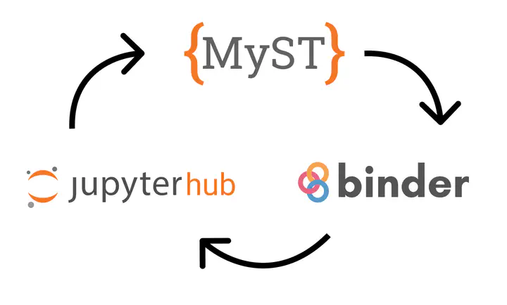 We’ve recently been working to integrate Jupyter Book 2 workflows with our community hubs for a more seamless experience (for example, having book pages link back to interactive cloud sessions that allow users to interact with the content). We imagine a network of Jupyter Books that all build upon the same core infrastructures (JupyterHub, Binder, etc) for cloud-based computing. Our hope is to allow a user to bring their own Binder with them so that they can interact with another book’s content with their own cloud infrastructure. For example: