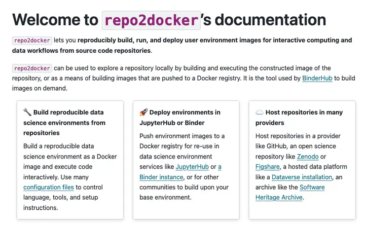 As part of this work, we decided to do a small overhaul of repo2docker’s documentation, with the goal of making it easier to discover, navigate, and learn from. Here’s how the landing page looks now!